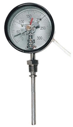 電接點雙金屬溫度計是利用溫度變化時帶動觸點變化,當(dāng)其與上下限觸點接觸或斷開的同時,使電路中的繼電器動作,從而自動控制和報警。